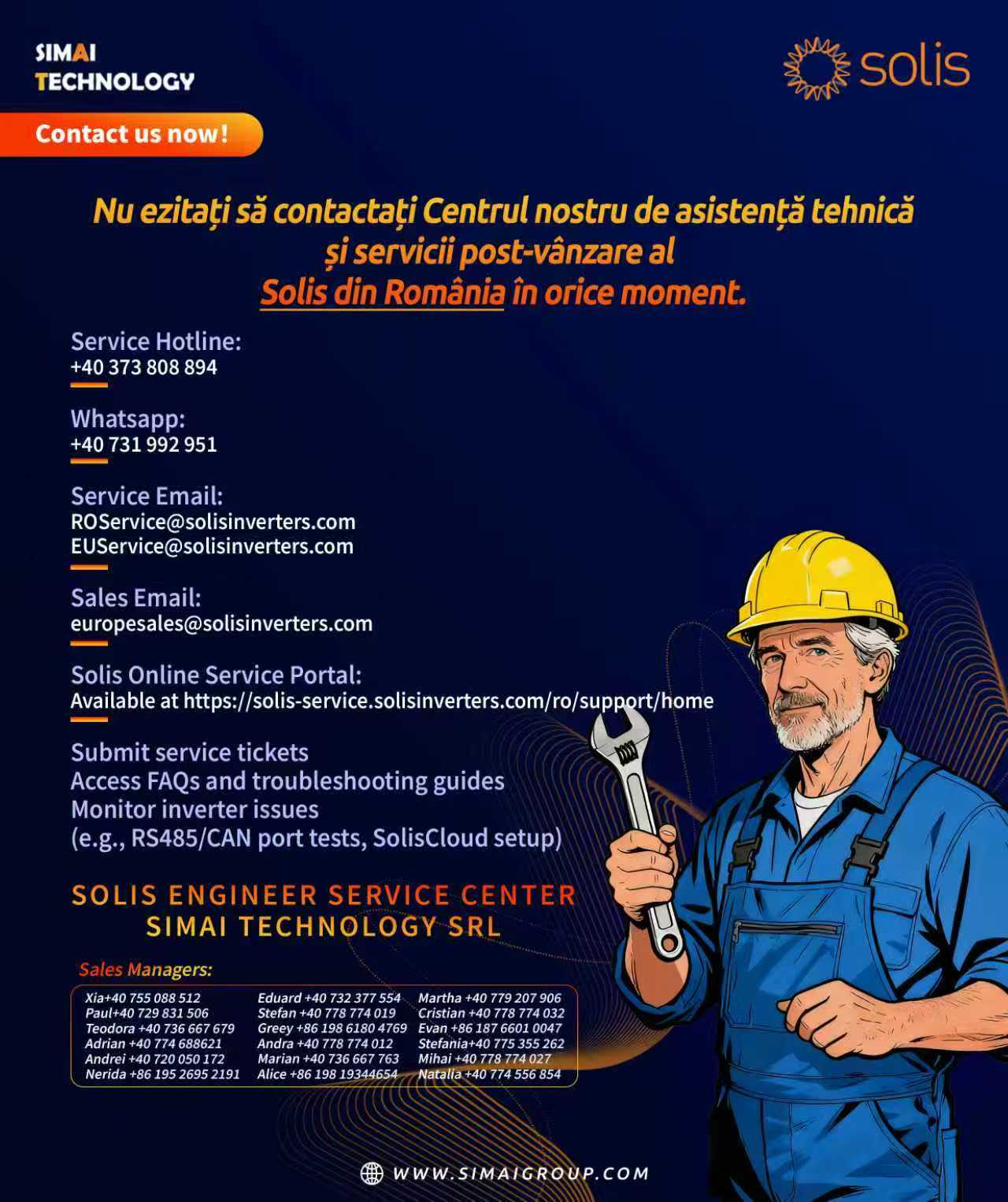 Simai Technology і Solis надають першочергову технічну допомогу та післяпродажне обслуговування. Збережіть цю контактну картку, щоб миттєво зв’язатися з нашою командою в Румунії через нашу гарячу лінію, WhatsApp або онлайн-сервісний портал для усунення несправностей, запитів щодо продажу та запитів у службу підтримки.